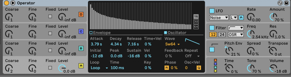 The Bee sound effect was a product of a lot of trial and error when experimenting with Ableton’s Operator. By changing parts of the instrument slowly, I was able to gradually create a more bee-like sound, using volume to add a sense of realness to the bee. After some research, I discovered that bees buzz in the key of C. This inspired me to base any musical elements around the key of C.